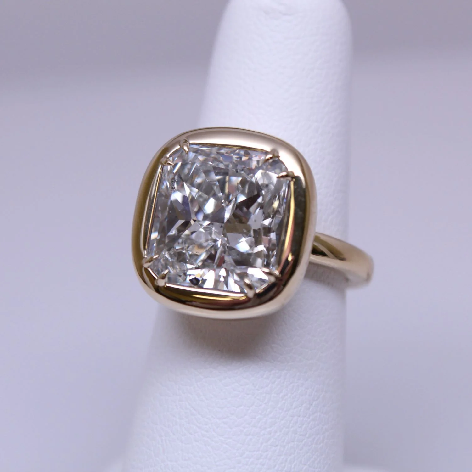 18K Yellow Gold with One Radiant Cut Diamond=8.88 CTS, J Color, SI2 Clarity, GIA #2225857659, Bezel Set, Finger Size 6.5